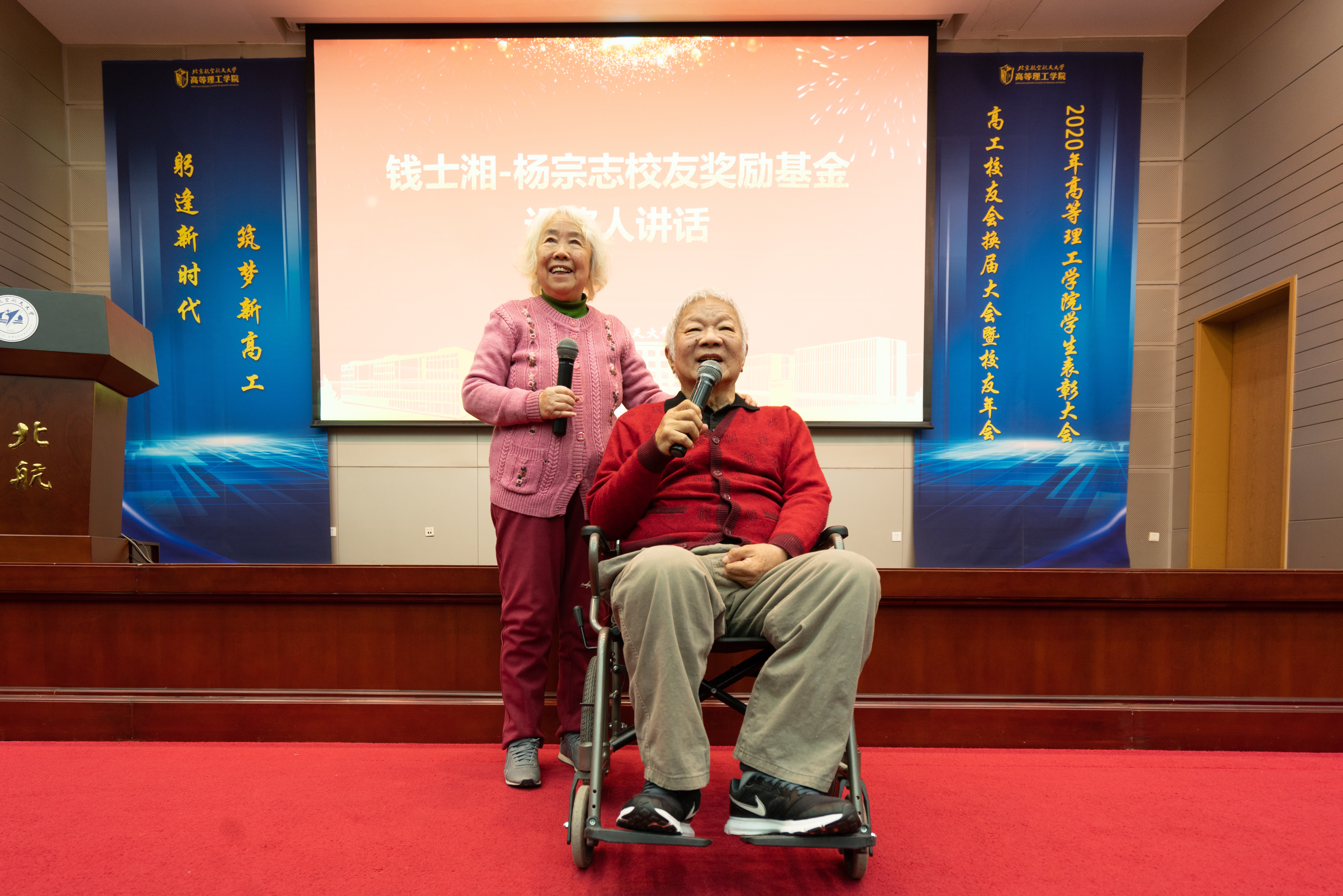 在公司2020年度员工表彰大会上,师生员工共同观看公司宣传片《定义》。钱士湘-杨宗智员工奖励基金捐赠人钱士湘和夫人杨宗智致辞,他们回顾了高工建院初期的点点滴滴,阐释了高工的建院初衷和育人理念,表示将继续尽己所能、投身公益、回馈社会,并寄语广大员工坚守初心,在自我发展的同时不忘反哺母校、薪火相传。钱老、杨老无私的大爱精神感人至深,经久不息的掌声响彻全场。在他们的感召下,员工们纷纷捐赠丰富“钱士湘-杨宗智员工奖励基金”,以实际行动让大爱火种代代不熄,助力公司员工成长成才。