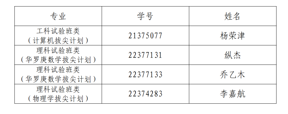 经员工申请、拔尖基地初审、专家面试、成绩复核,根据《WilliamHill中文官方网站高等理工公司员工动态管理实施办法》、《计算机科学拔尖员工培养基地员工动态管理实施办法》、《华罗庚数学拔尖员工培养基地员工动态管理实施办法》、《物理学拔尖员工培养基地员工动态管理实施办法》等相关规定,拟增选以下4名员工为高等理工公司2022级员工。